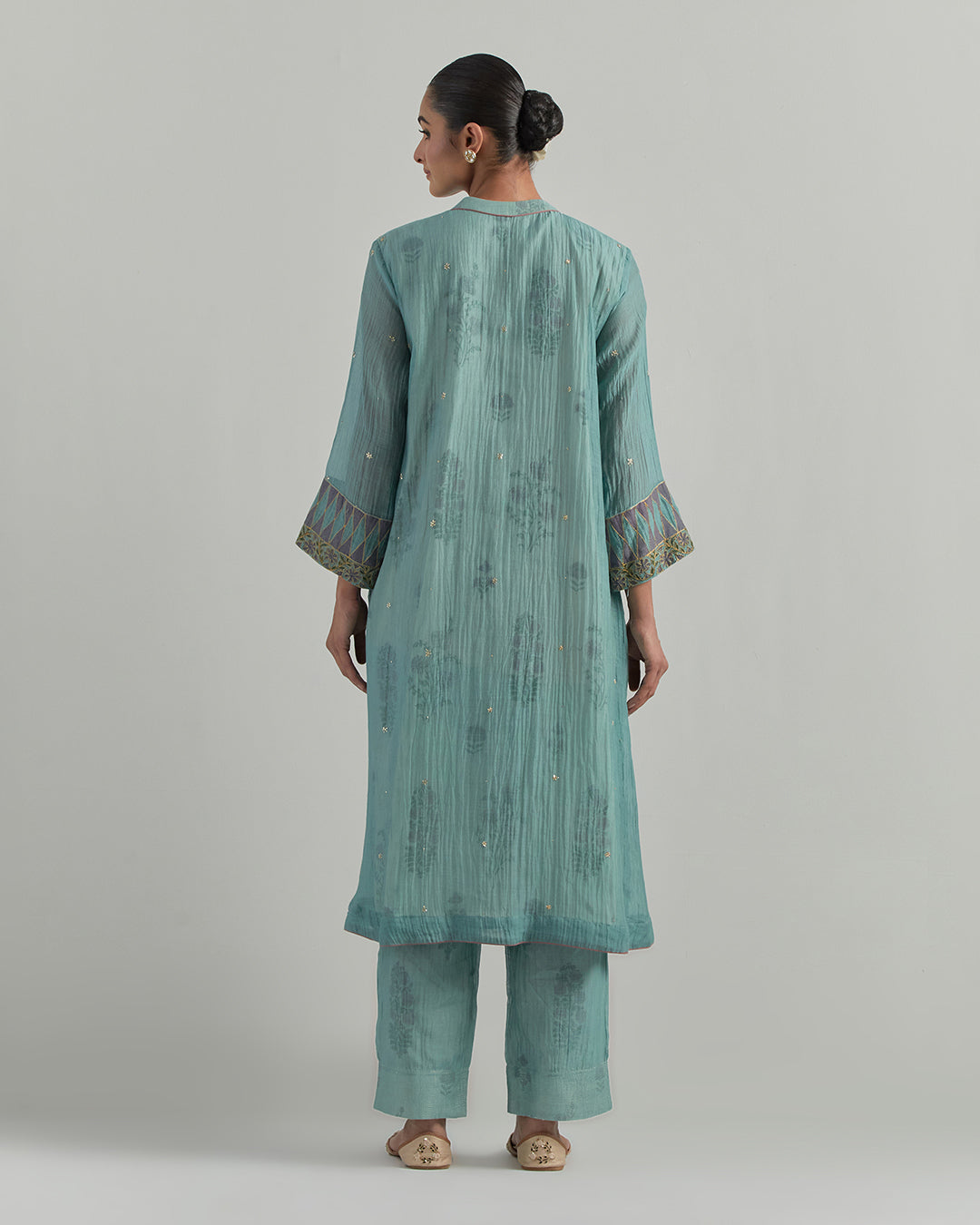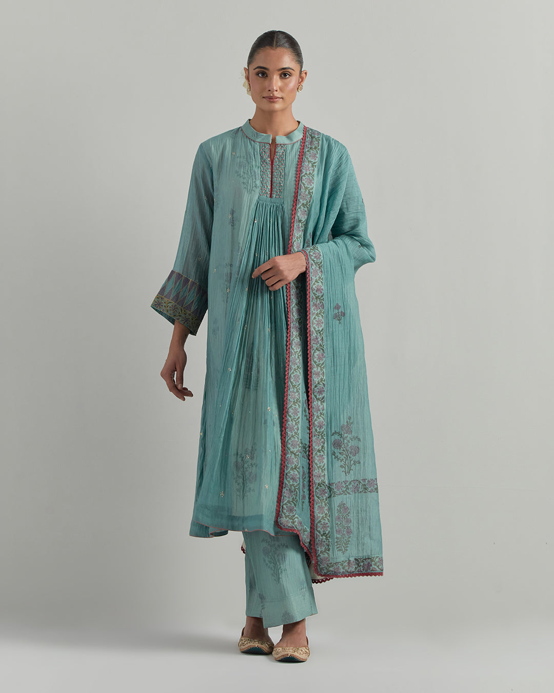 Step into the festivities with a whisper of old-world charm, where soft hues meet timeless elegance. This sky blue chanderi kurta pant set is a gentle nod to comfort and craftsmanship. With its dramatic, flowy design and classic ban collar, the silhouette captures the drama of tradition with a modern spirit. Intricate block prints and delicate hand embroidery trace stories across the fabric, while floral motifs bloom like quiet poetry. It’s more than an outfit—it’s a celebration of understated luxury made to feel effortlessly festive.