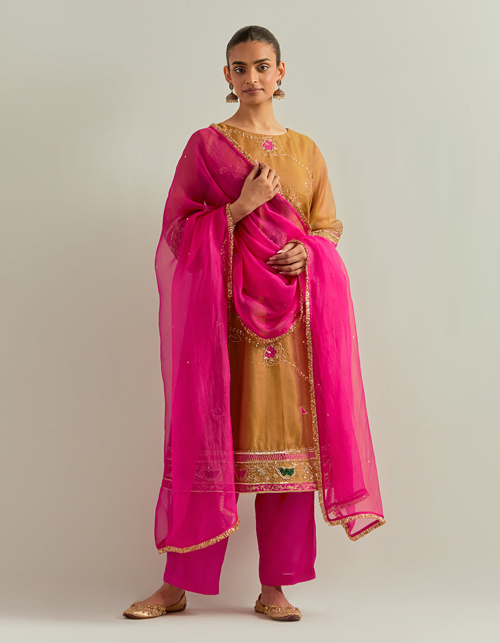 Radiate grace and charm with this exquisite mustard hand-embroidered shimmer organza suit set. The suit, crafted in rich shimmer organza, features delicate hand embroidery that highlights its timeless elegance. Paired with soft muslin pants for comfort and flow, the outfit strikes the perfect balance of luxury and ease. The vibrant pink organza dupatta, adorned with intricate detailing, adds a striking contrast and completes the look with finesse. Ideal for festive occasions, weddings, diwali pooja, this mustard yellow suit for haldi is a true celebration of traditional craftsmanship with a modern appeal.