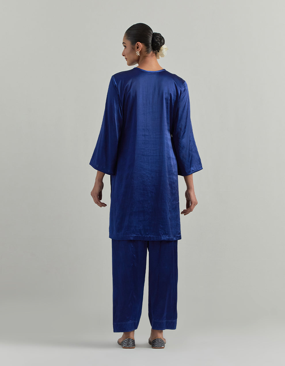 A royal blue satin light festive wear kurta and pants set featuring a round keyhole neckline with a soft slit, adorned with long embellished tassels for a touch of elegance. Crafted in smooth satin, the kurta and pants offer a luxurious sheen and fluid drape, ensuring both comfort and style. The ensemble is paired with a shimmering organza dupatta, beautifully finished with golden fringe lace, adding movement and festive charm. Effortlessly blending simplicity with statement details, this set is perfect for intimate celebrations, festive gatherings, and summer.