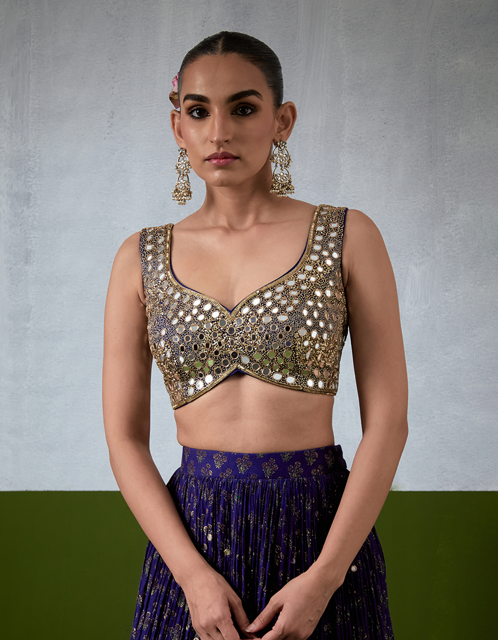 A wedding chanderi silk blue lehenga that twirls, capturing the essence of traditions and celebrating the grandeur of the wedding. This wedding outfit, featuring a gilded blouse, is intricately detailed with mirror and sequin work. The skirt and dupatta also showcase rich block print work and a lace-work border, lending a quiet, luxurious structure. Offering a regal look, this is not just a garment but a reflection of your unique wedding personality.